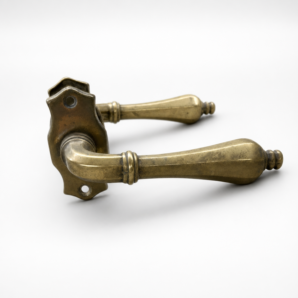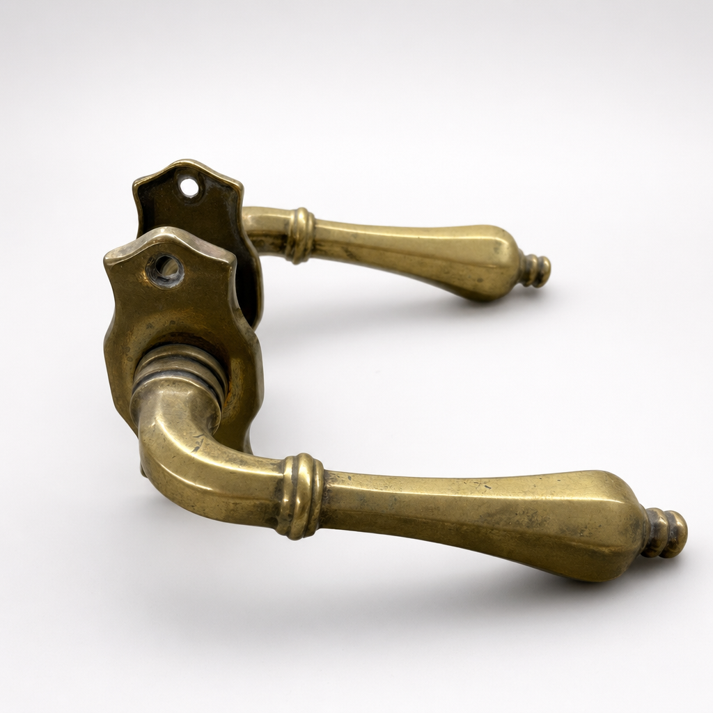 Een klassieke deurklink van massief messing met een warme, gedempte goudtint die alleen ouder messing heeft. De klink heeft een sierlijk taps toelopende greep met gedraaide nekring en een afgeronde knop als eindstuk, gemonteerd op een geprofileerd schildvormig rozet. Solide van gewicht, mooi van vorm.