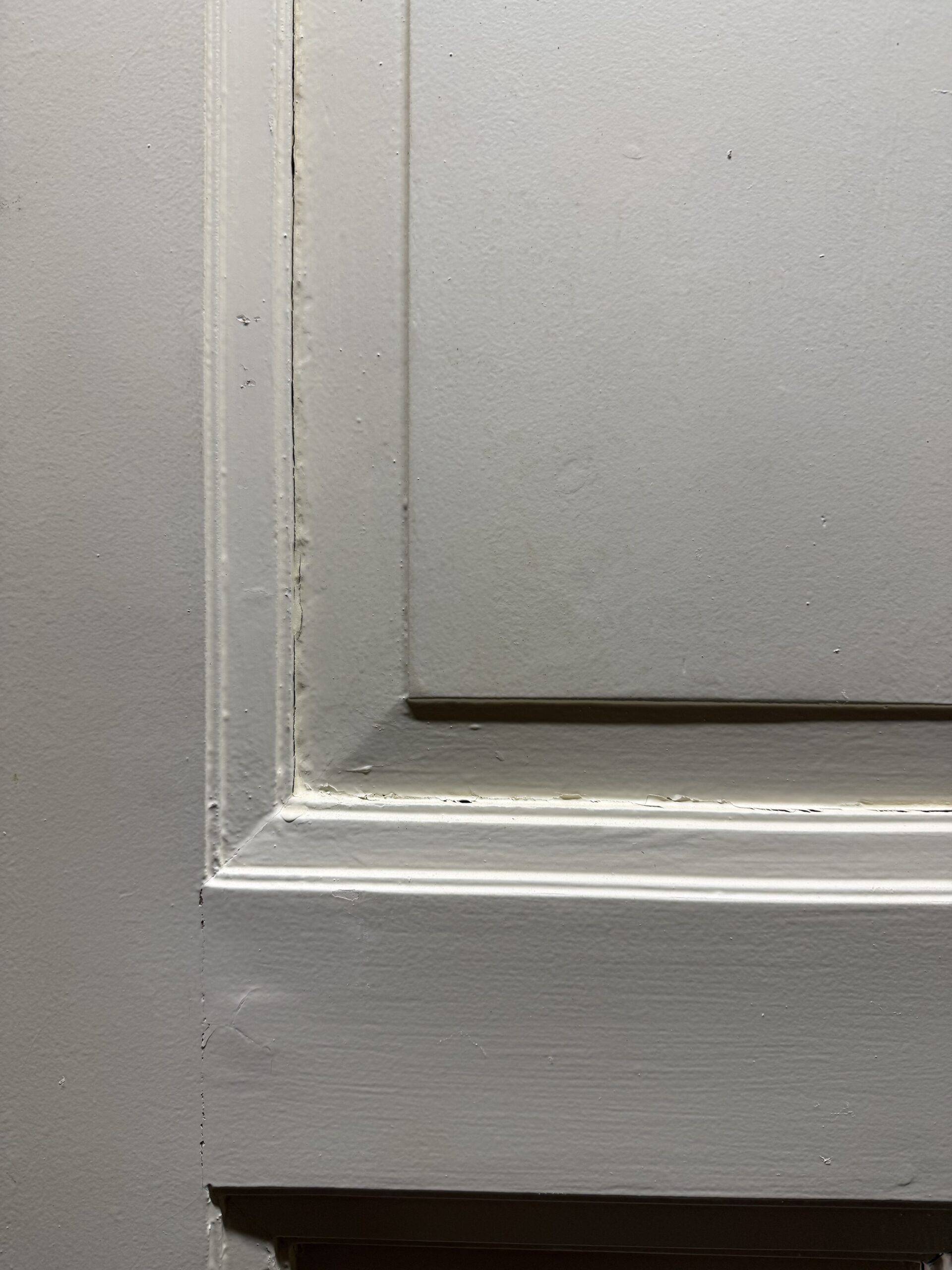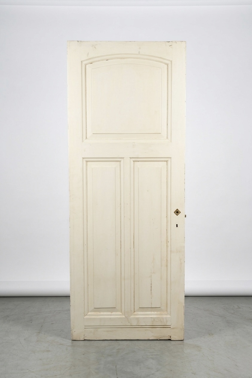 Een stijlvolle antieke binnendeur met een opvallende vlakindeling: een breed bovenpaneel met sierlijke boogvorm, gevolgd door twee smalle verticale onderpanelen met fijn gefreesde streepprofilering. Dit type deur is kenmerkend voor de Nederlandse burgerwoning- en heerenhuisbouw uit de late 19e en vroege 20e eeuw.