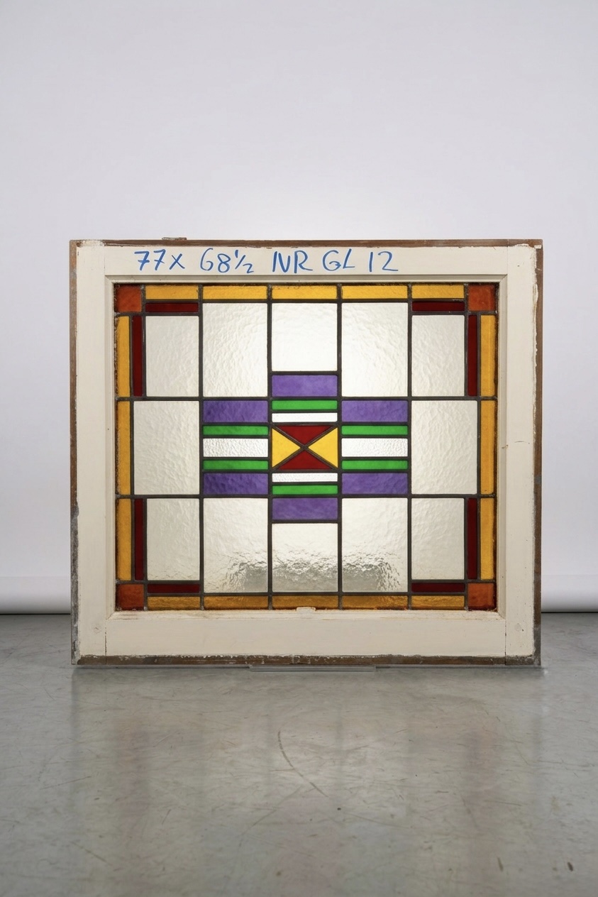 Dit prachtige antieke glas-in-lood raam is een authentiek voorbeeld van de Art Deco stijl die zo kenmerkend is voor de Nederlandse woningbouw van de jaren ’20 en ’30. Het geometrische patroon met een sterk centraal motief in paars, groen, rood en goudgeel straalt rust en symmetrie uit en trekt meteen de aandacht.