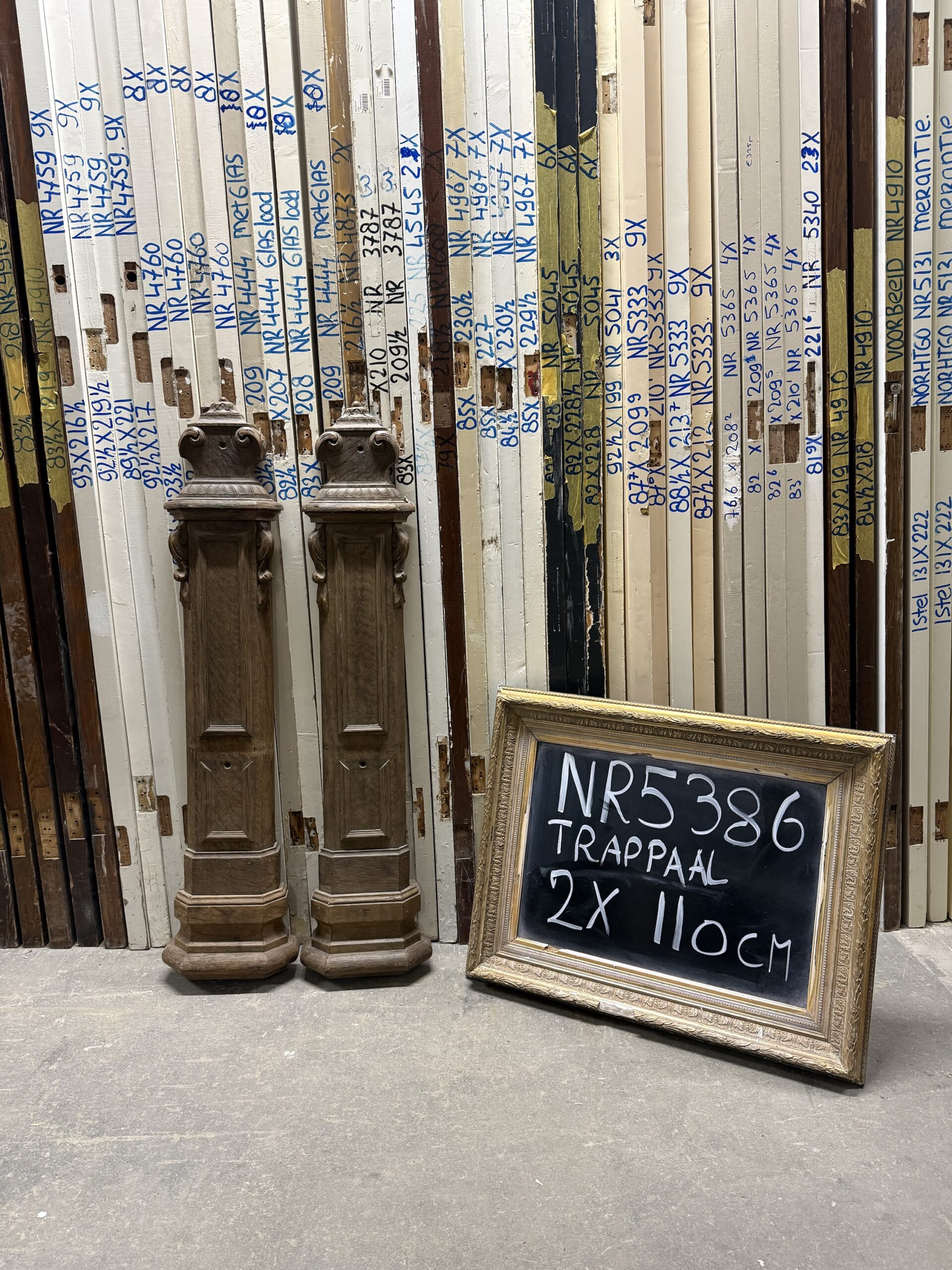 Dit soort palen werd vroeger toegepast in deftige trappenhuizen van herenhuizen en villa’s, waar de trap langs de wand liep. Ze zijn nu zeldzaam te vinden als compleet stel in deze staat.