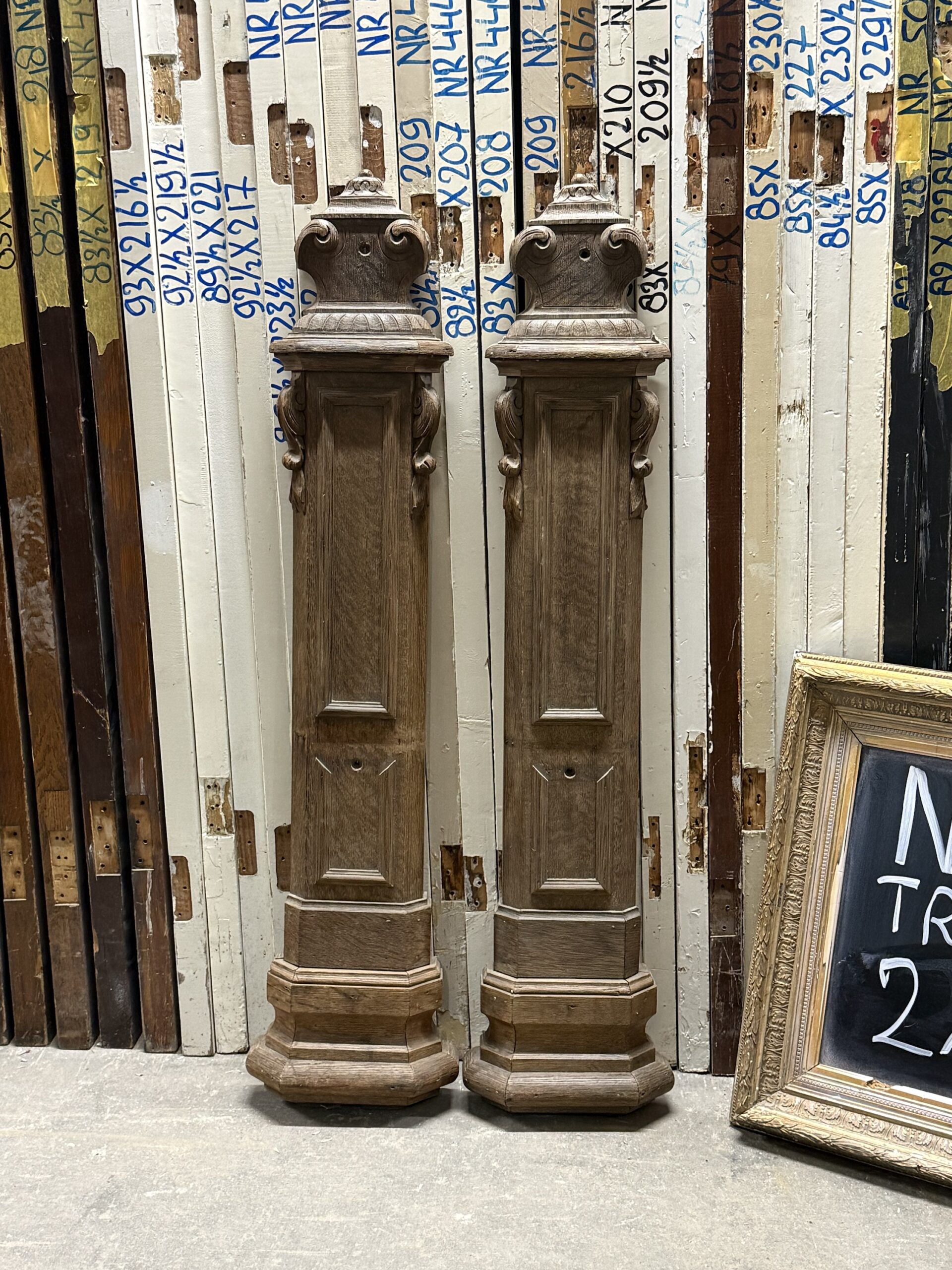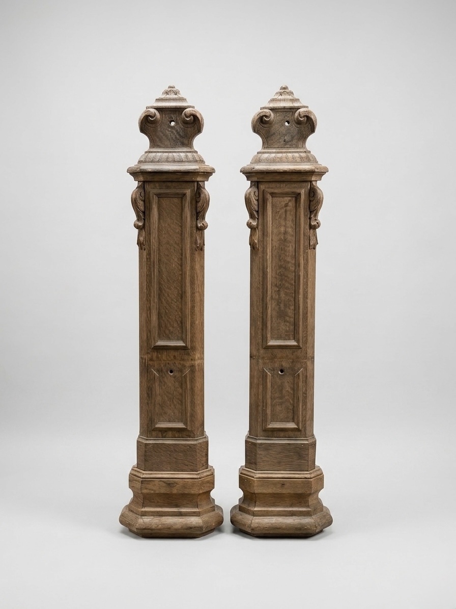 Twee bijzondere antieke trappalen van massief eikenhout, 110 cm hoog, speciaal ontworpen om tegen de muur te bevestigen. De achterzijde is volledig vlak, waardoor ze strak en netjes tegen de muur monteren zonder enige speling.