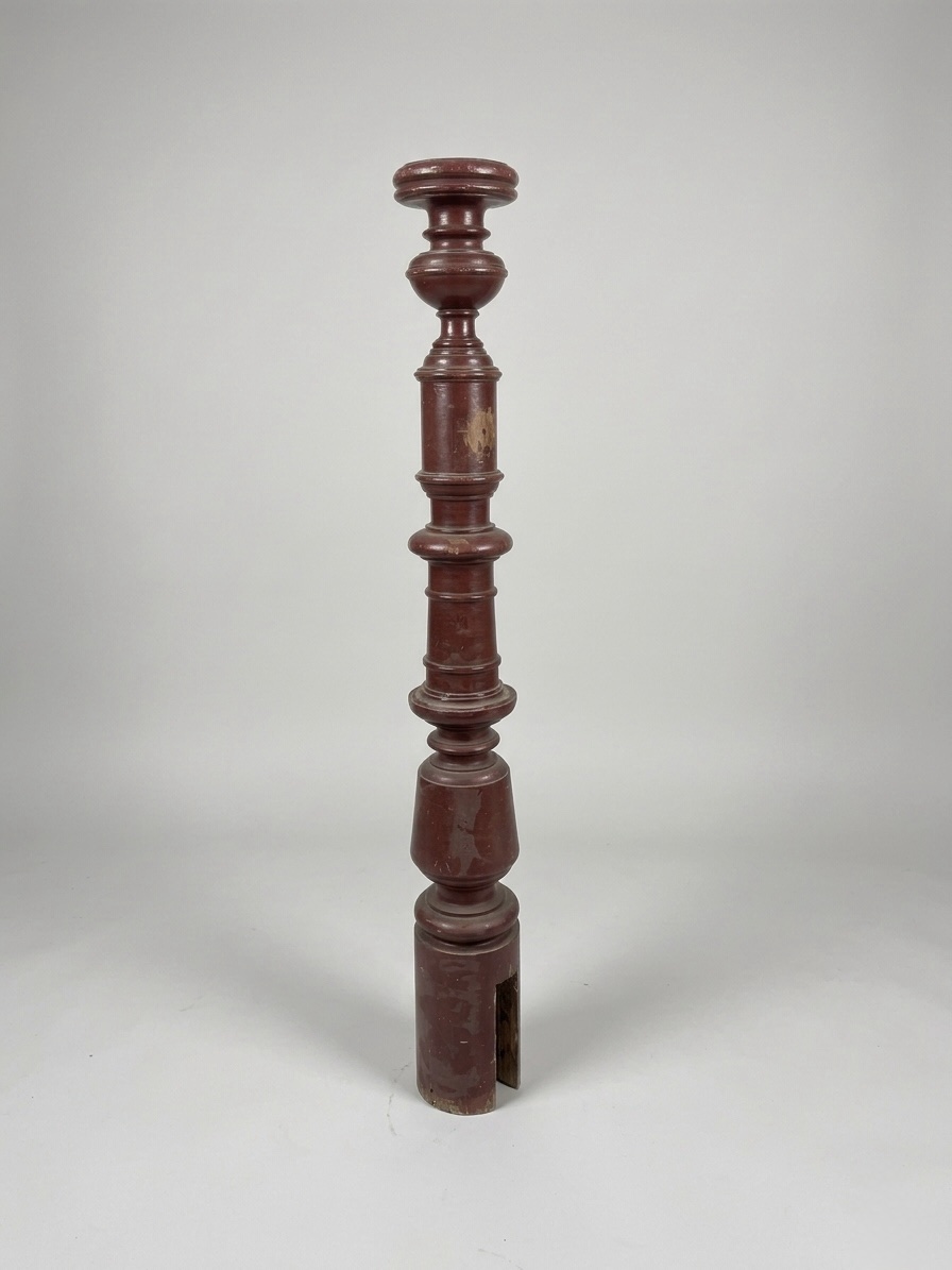 Een slanke, gedraaide trappaal van 115 cm hoog, opvallend door zijn diepe bordeauxrode kleur. De schacht bestaat uit een ritmische opeenvolging van gedraaide bollen, ringen en cilindervormige zones, een klassiek draaiwerkmotief dat in deze kleur een bijzonder karakter krijgt.