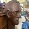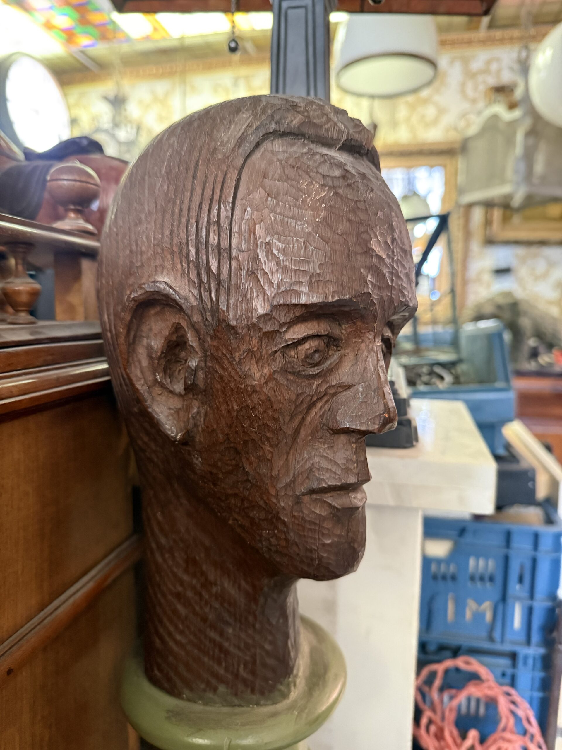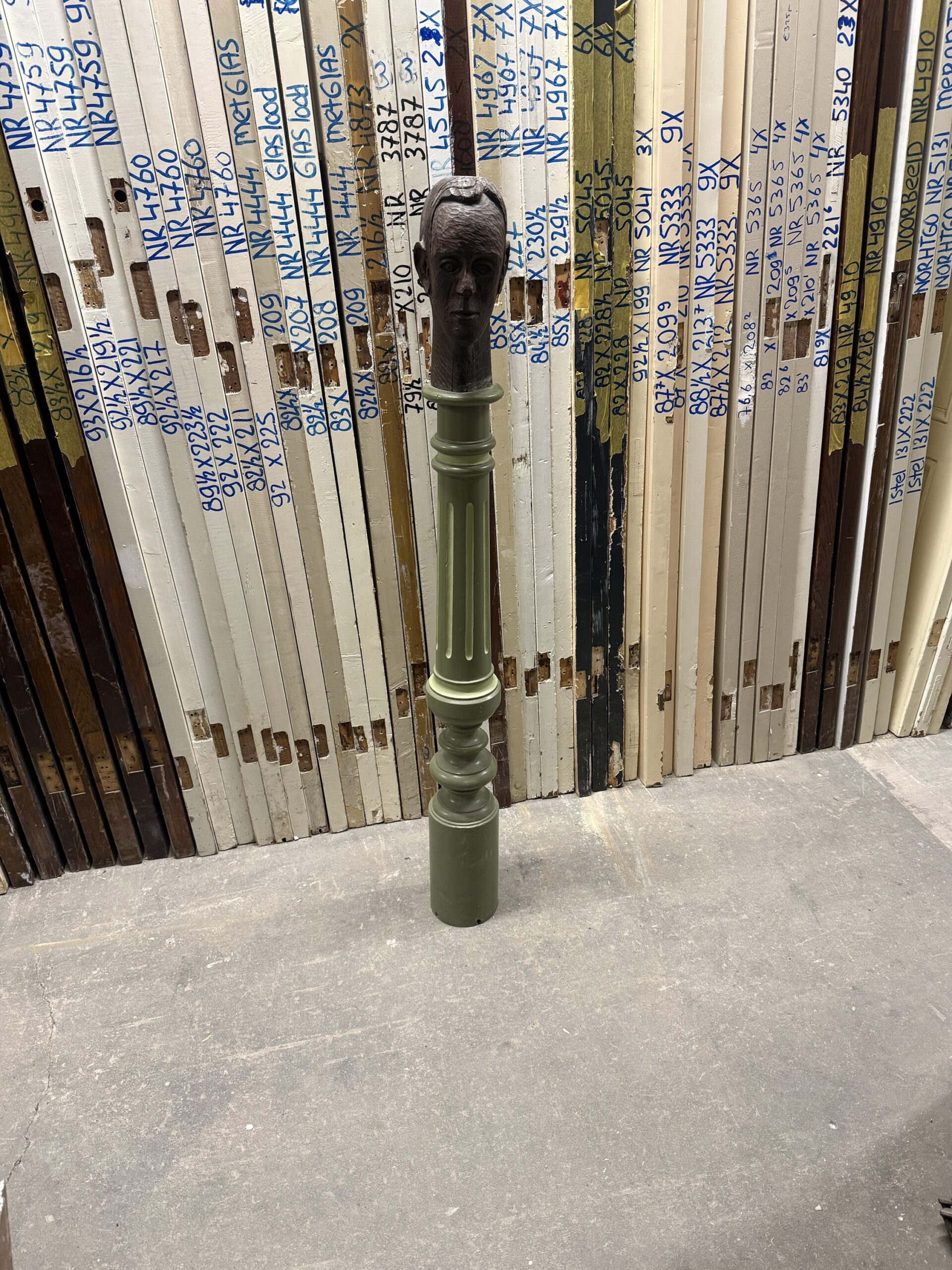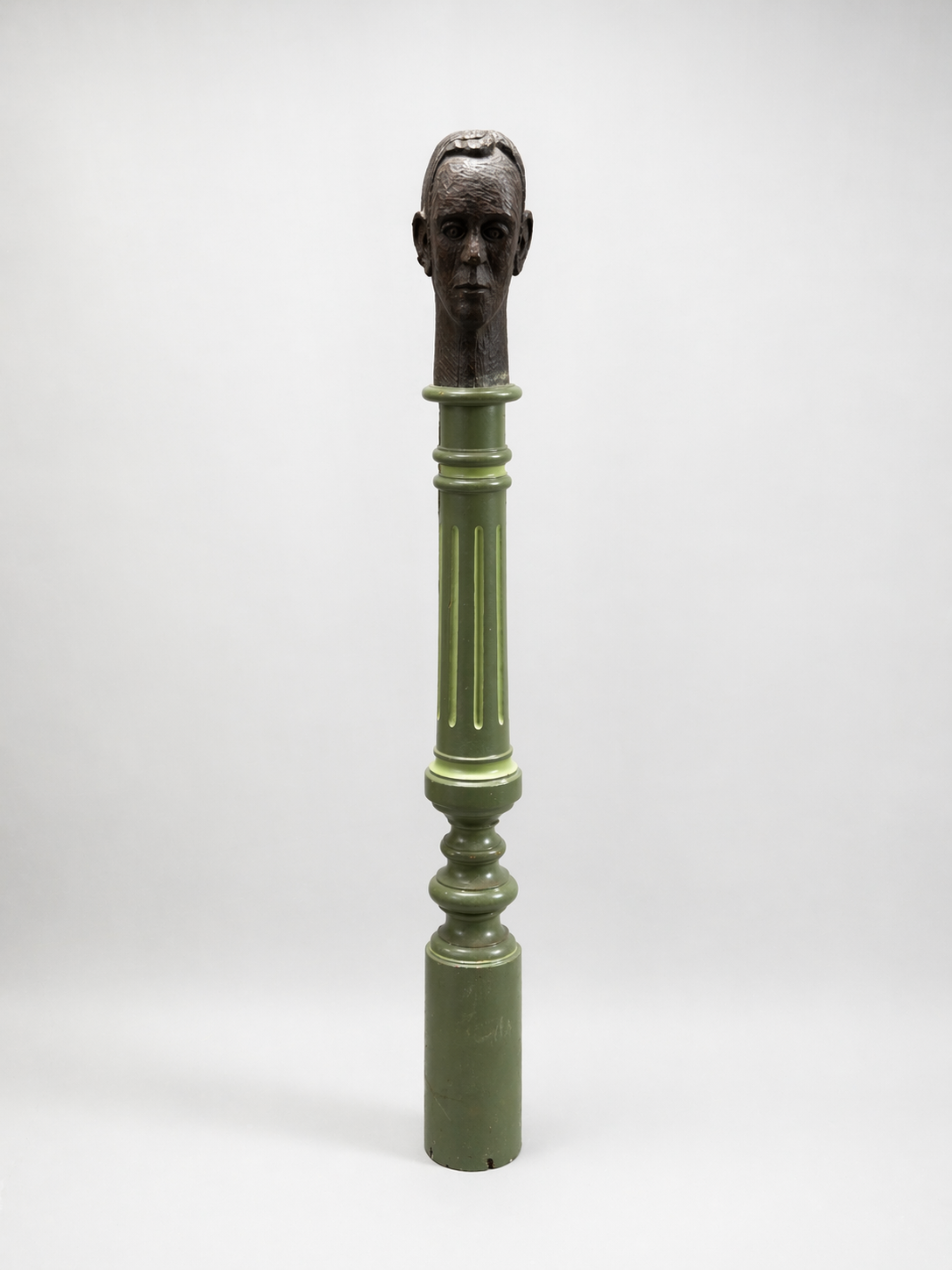 Een groengeschilderde houten trappaal van 135 cm hoog, met een gedraaide schacht en verticale ribben, zoals je die vaker tegenkomt in herenhuizen uit de late negentiende of vroege twintigste eeuw. Maar wat deze paal uniek maakt, staat bovenop: een met de hand gesneden mannenhoofd in donker hout, realistisch van uitdrukking en vakkundig uitgevoerd. Wie er dit hoofd op heeft gesneden, en waarom, is niet meer te achterhalen. Dat maakt hem alleen maar intrigerender.