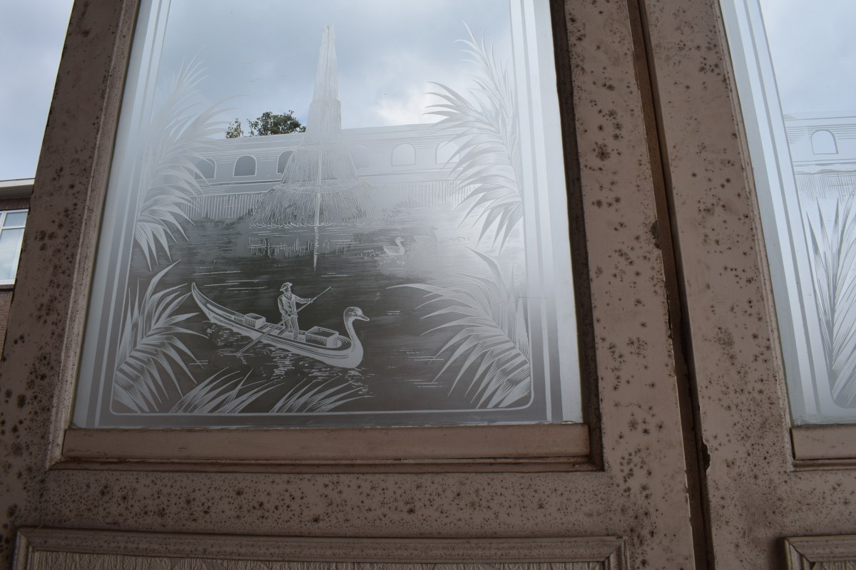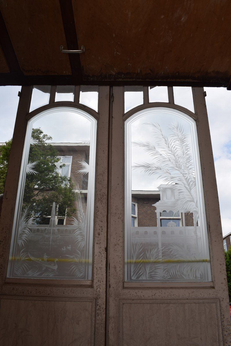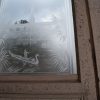Beautiful set with windows etched in the center with drawing a at the top faceted windows.